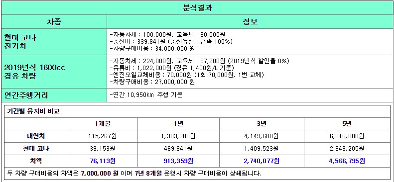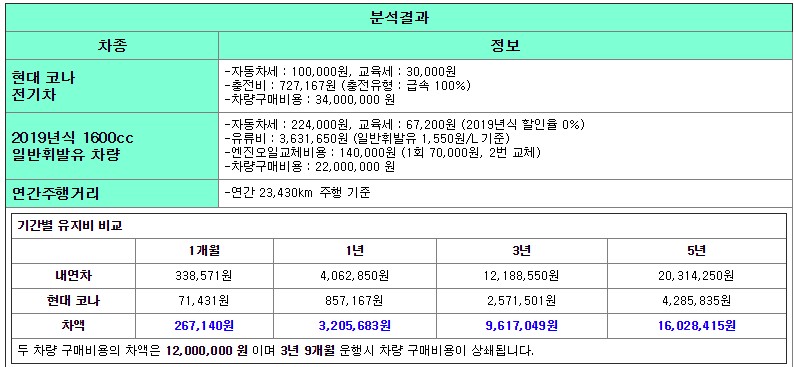 전기차유지비 계산기를 통한 전기차와 내연기관차의 유지비 비교 결과입니다.